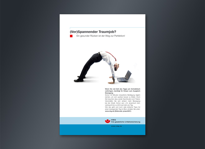 Für die gesetzliche Unfallversicherung VBG hat die Mattheis Werbeagentur aus Berlin eine Anzeigenserie zu verschiedenen Gesundheitsthemen konzipiert, gestaltet und getextet.