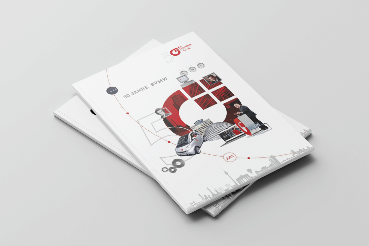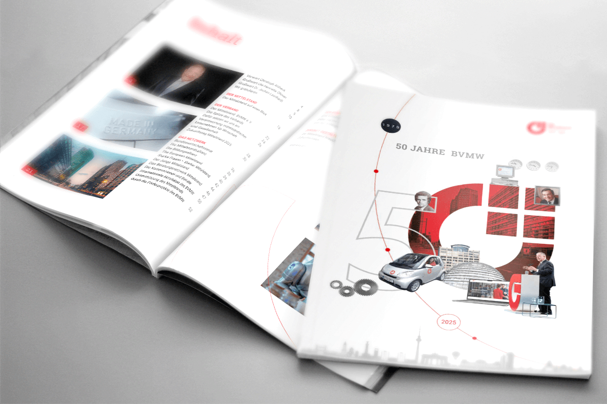 Bereits seit 2010 gestalten wir das Magazin „Mittelstand.“, das Unternehmermagazin des BVMW, des Bundesverbandes mittelständische Wirtschaft. (BVMW) Zum 50-jährigen Jubiläum des Verbands entstand eine umfangreiche Publikation, die Geschichte, Gegenwart und Zukunft des deutschen Mittelstands dokumentiert. Das über 100 Seiten starke Jahrbuch verbindet politische Stimmen, Interviews, Zahlen und Bildstrecken zu einem eindrucksvollen Gesamtwerk.
