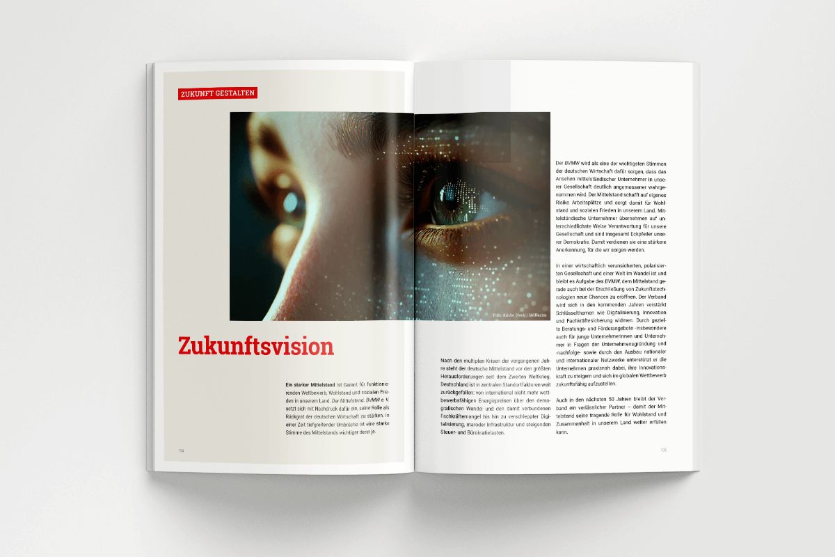 Der BVMW wollte ein Jubiläumsbuch, das Inhalt und Gestaltung auf Premium-Niveau vereint. Unsere Aufgabe: Aus den gelieferten Daten ein durchgängig strukturiertes, starkes Editorial Design zu entwickeln, das Orientierung schafft, visuell überzeugt und dem Anlass gerecht wird.