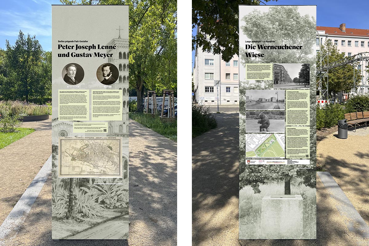 Infostelen im Lenné-Meyer-Garten am Volkspark Friedrichshain