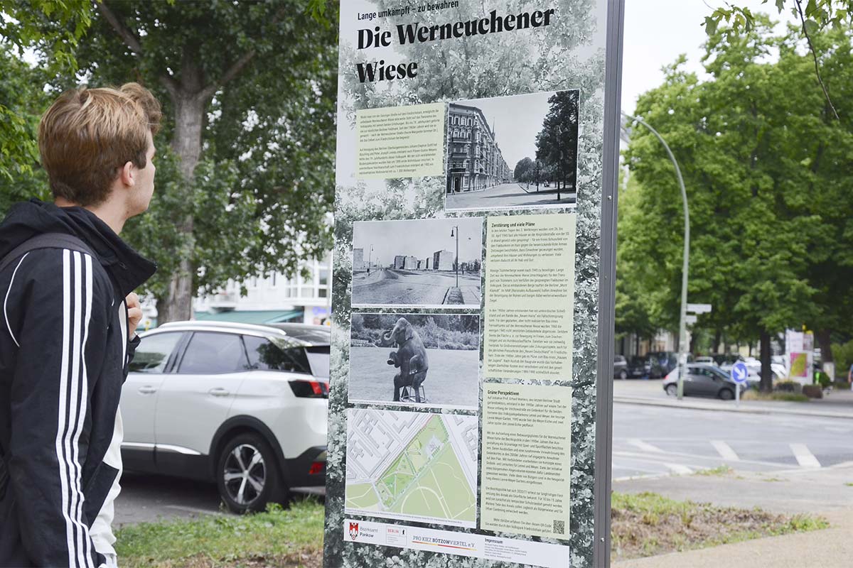 Auf der Grenze zwischen Berlin-Prenzlauer Berg und -Friedrichshain gibt es die so genannte Werneuchener Wiese. Direkt am Volkspark Friedrichshain gelegen, war es in den letzten Jahren ein eher unscheinbarer Ort. Die wechselvolle Geschichte dieser Baulücke mitten im belebten Kiez war für die vorbeigehenden Parkbesucher:innen nicht zu erkennen. Die Wiese selbst am Rand des Areals war verwildert, ein alter Gedenkstein überwuchert, die irgendwann einmal gepflanzte Lenné-Eiche kaum als solche erkennbar.