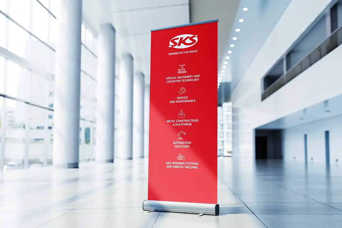 Die Gestaltung des Messestands setzt auf ein reduziertes Design mit deutlicher Struktur. Klare Flächenaufteilung, großflächige Originalbilder, Farbkontraste im SKS-Rot, Weiß und Dunkelgrau sowie klare Textbotschaften schaffen eine visuelle Sprache, die im Messeumfeld sofort auffällt. Die Wandgestaltung aus hinterleuchteten Elementen inszeniert das Thema Sondermaschinenbau und Fördertechnik kompakt und pointiert. Das Roll-Up macht den Leistungsumfang von SKS sichtbar und ist flexibel einsetzbar.