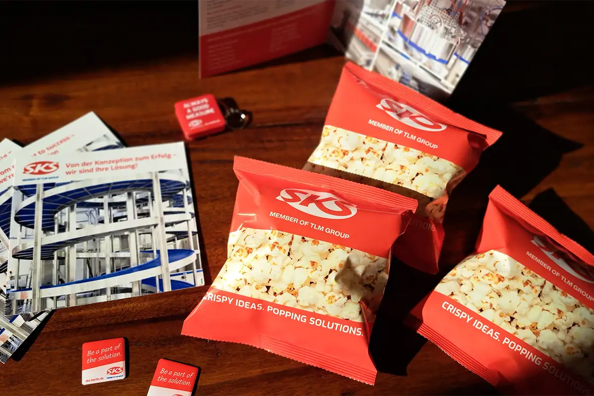 Eigentlich hatten wir vorgeschlagen, frisches Popcorn zu verteilen – zwischen all den Gummibärchen und Kugelschreibern, die auf Messen verteilt werden, ist Popcorn eine auffallende Besonderheit. Außerdem lockt der Duft unwiderstehlich und Messebesucher:innen werden quasi magisch angezogen. Da die Popcornmaschine aus Sicherheitsgründen aber verboten wurde, haben wir uns kurzerhand einen kreativen Umweg überlegt: Wir haben Popcorntüten für den Messestand produzieren lassen. Im Corporate Design von SKS und mit dem augenzwinkernden Claim „CRISPY IDEAS. POPPING SOLUTIONS“. Und der Duft? Den erzeugte ein Aroma-Diffuser, der mit Karamellduft bestückt wurde. Dieses multisensorische Erlebnis sorgte wie gewünscht für Neugier und lenkte gezielt die Fachbesucher zum Messestand von SKS.